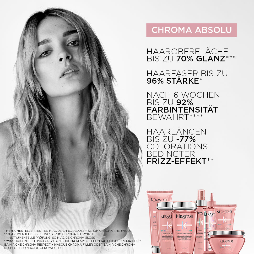 KÉRASTASE CHROMA ABSOLU BAIN CHROMA RESPECT: Eine haselnussgroße Menge entnehmen, aufschäumen und einmassieren, anschließend gründlich spülen und die Haare mit entsprechenden Produkten weiterbehandeln. Bei Kontakt mit den Augen diese sofort gründlich ausspülen. KÉRASTASE CHROMA ABSOLU FONDANT CICA CHROMA: Eine kleine Menge entnehmen und auf das gewaschene, handtuchtrockene Haar gleichmäßig in Längen und Spitzen auftragen, 1 bis 2 Min. einwirken lassen und anschließend wieder gut ausspülen. Bei Kontakt mit den Augen diese sofort gründlich ausspülen. KÉRASTASE CHROMA ABSOLU SERUM CHROMA THERMIQUE auf das gewaschene, handtuchtrockene Haar sprühen und einarbeiten, nicht ausspülen, anschließend wie gewohnt trocknen. Bei Kontakt mit den Augen diese sofort gründlich ausspülen.